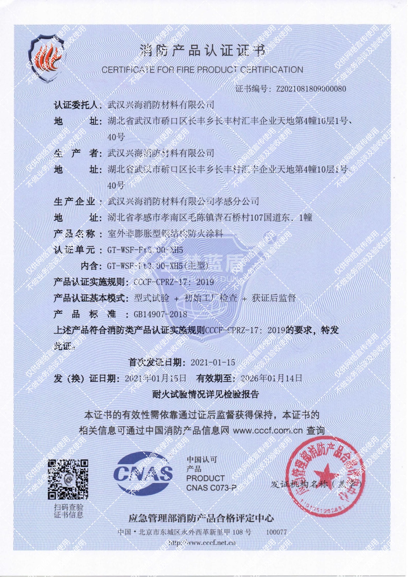 室外非膨脹型鋼結(jié)構(gòu)防火涂料消防產(chǎn)品認(rèn)證證書