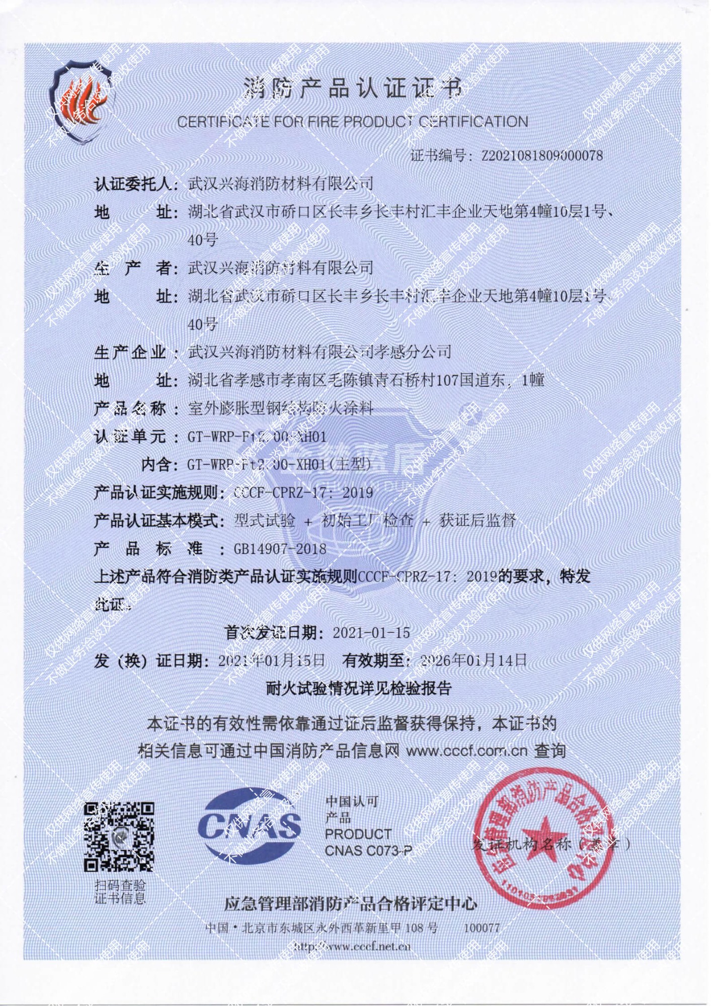 室外膨脹型(特種)鋼結(jié)構(gòu)防火涂料消防產(chǎn)品認證證書